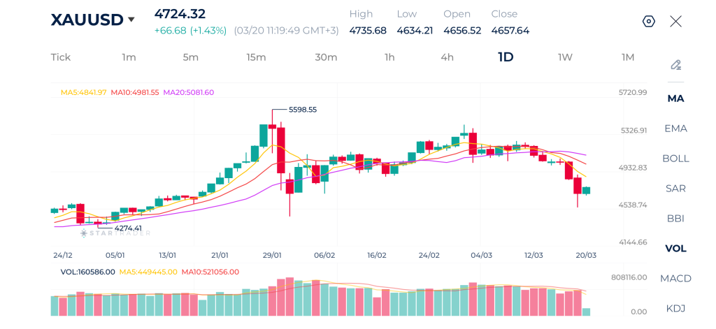 Hiện tại vàng đang giao dịch quanh mức $4.720, và biểu đồ cho thấy rõ một sự chuyển đổi xu hướng lớn từ tăng sang giảm trong ngắn hạn.